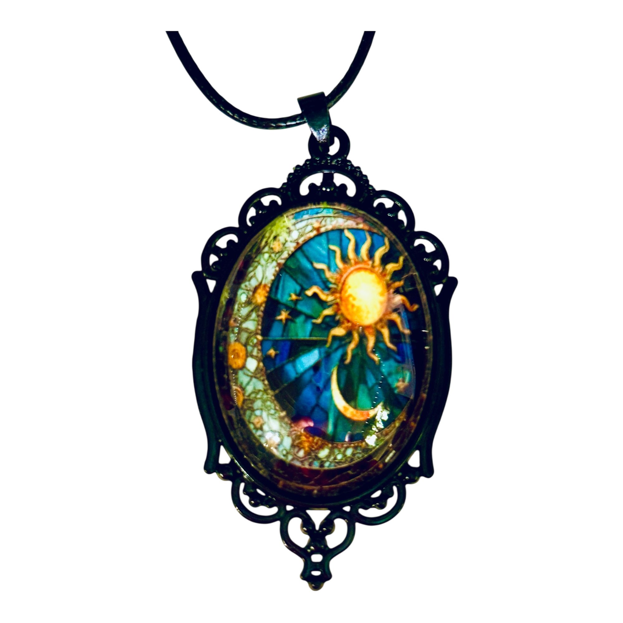 Design: An oval pendant featuring a stunning sun and moon celestial scene.